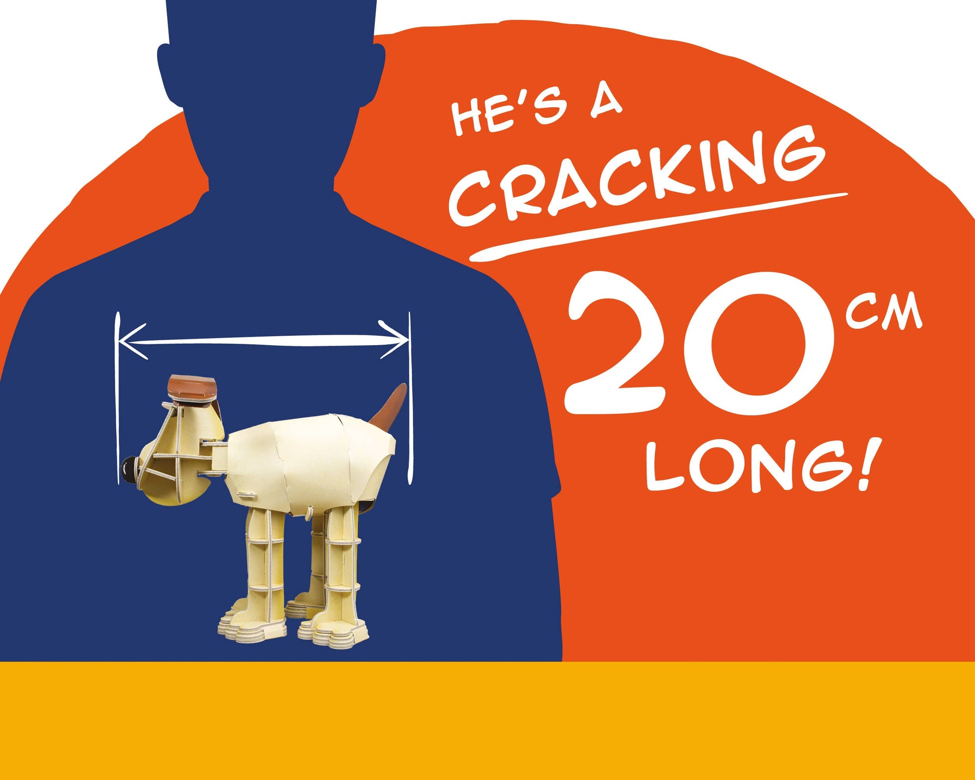 Simply slot together the cardboard parts to build your very own Gromit. The clever mechanics are cracking fun! Wag his tail for a realistic walking legs action; press Gromit’s head to raise his expressive ears and eyebrows. Atta boy, Gromit Lad!