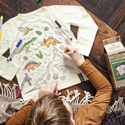 This beautifully packaged kids colour in top, creative kit includes; a long-sleeved round neck top, six fabric colour in pens and colour in practice hints & tips available for ages 2-12 years. The lightweight jersey blend top features a unique dinosaur colour in design, ready for your little kids to get creative with. The fabric pens use high-quality UV ink which can be air cured for 24 hours or ironed by a parent. The colours will not fade and can be worn time and time again.