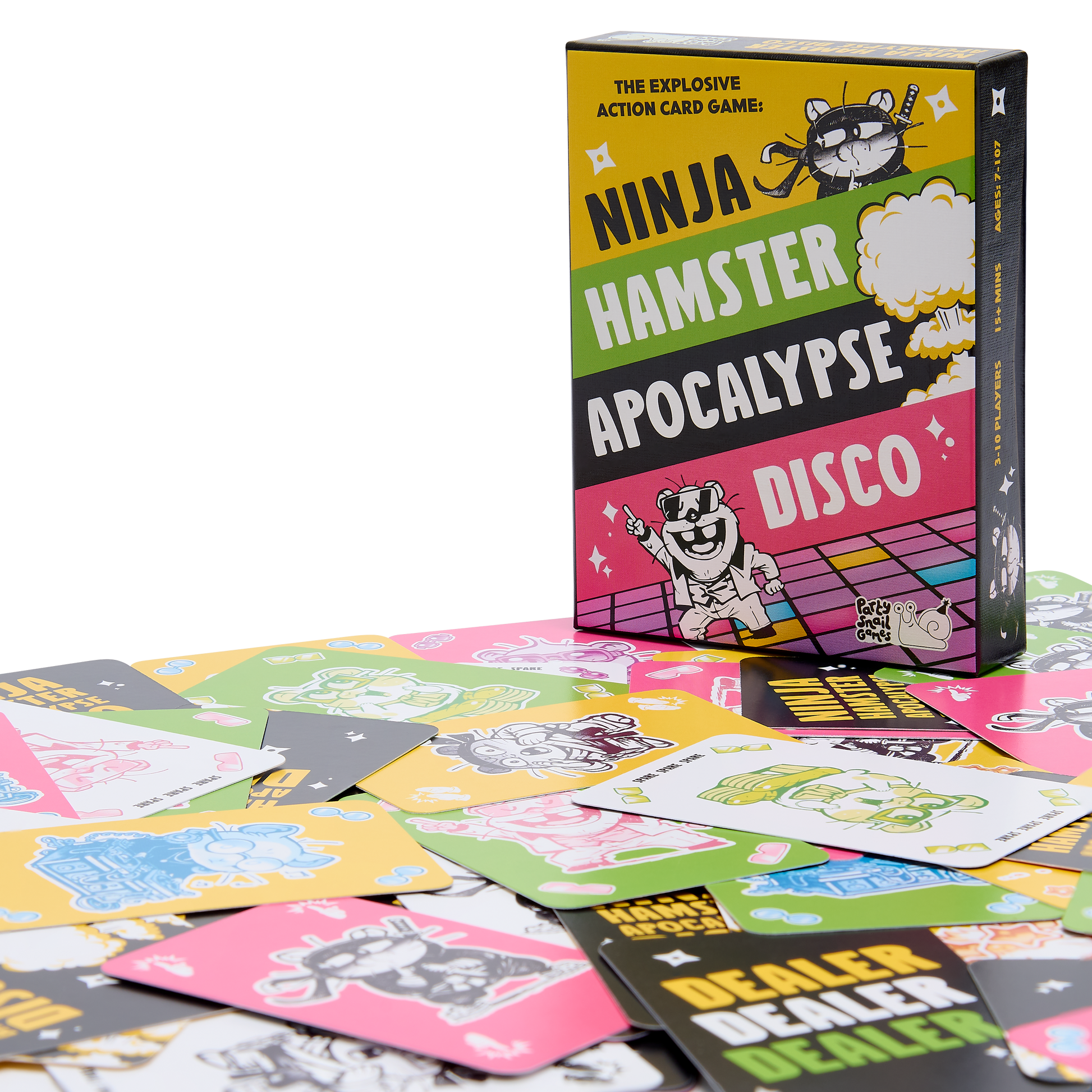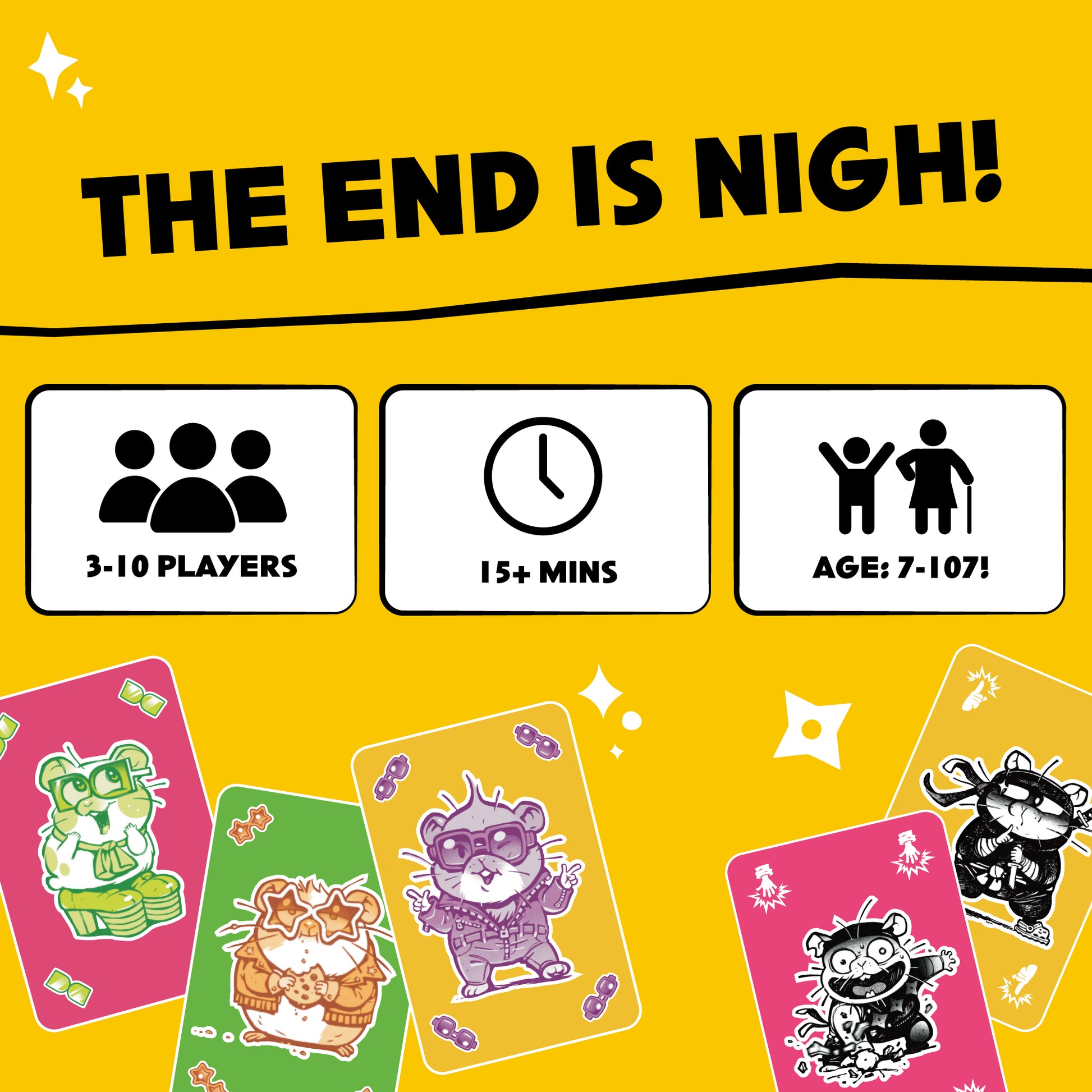 The end is nigh! Only your fast actions and reactions will keep you safe from (disco) armageddon in this hilarious family-friendly card game. Race to jump ahead of other players and get rid of all your cards first, harnessing your inner ninja hamster as you escape apocalyptic punishment from your friends, family and enemies.