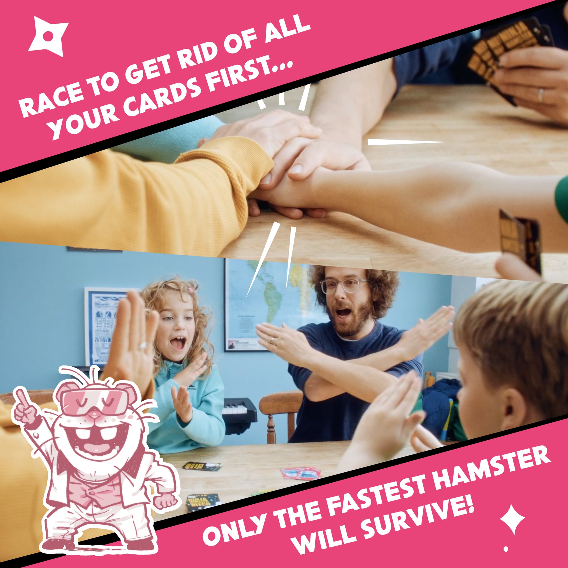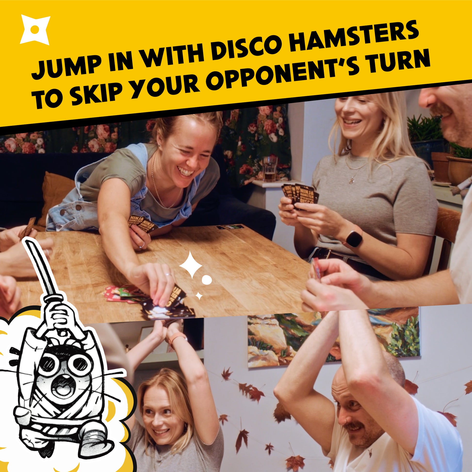 Play your ninja hamsters wisely to trigger actions around the table while you save your innocent disco hamsters one at a time, sneaking them into the whirlwind of moving hands and cards.