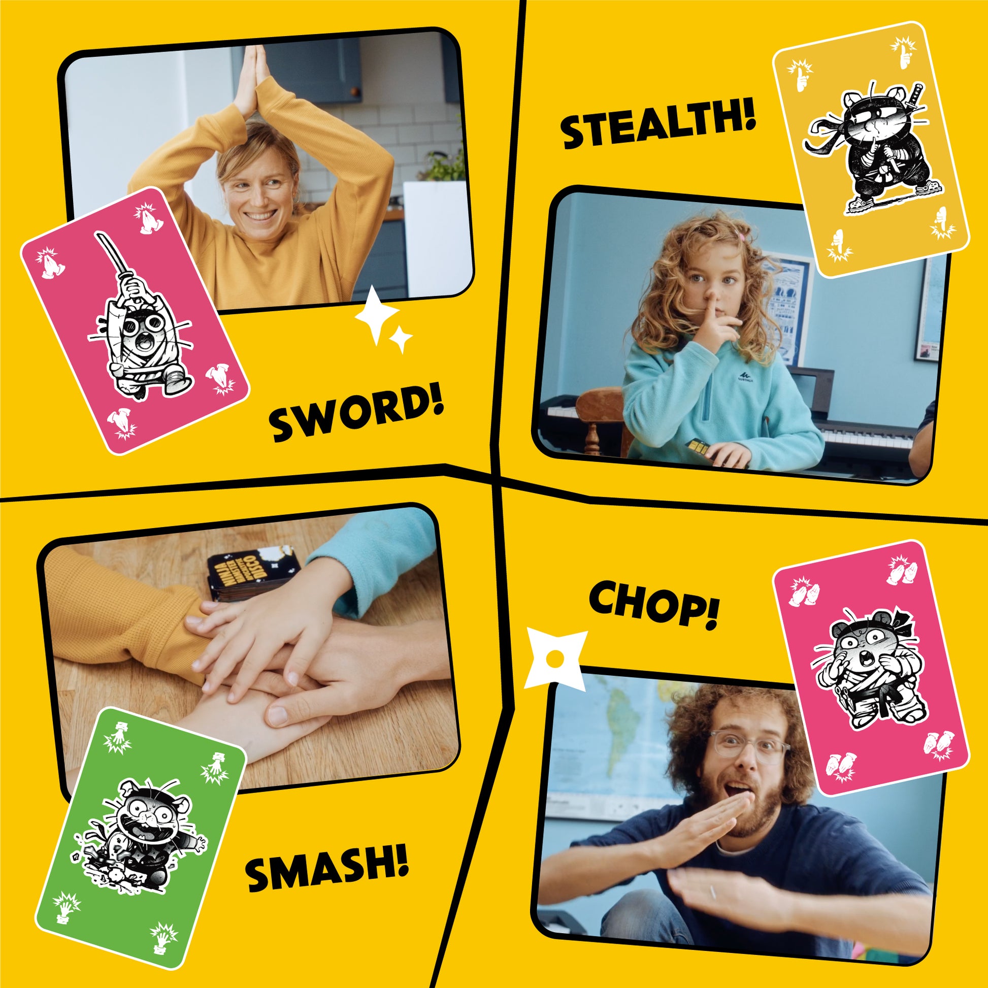 TRIGGER ACTIONS WITH NINJA HAMSTERS! Show no mercy as you punish your fellow players with the actions of your ninja hamsters. When a ninja hamster card is played, all players must follow the action AND sound. The slow to react will be punished…