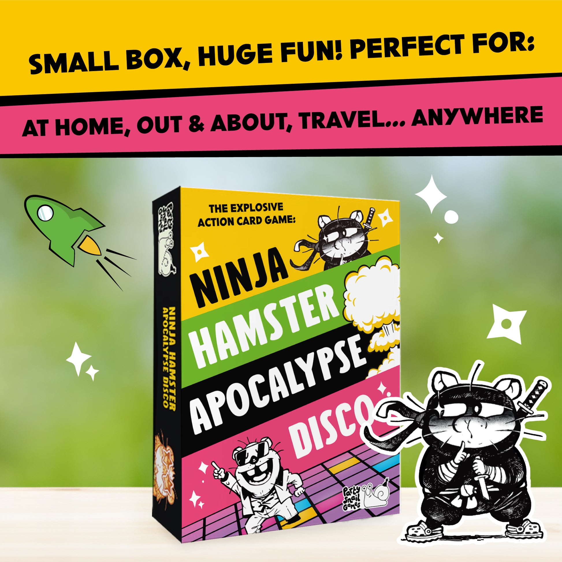 PERFECT SIZE FOR TRAVEL OR PLAY AT HOME: Super compact and easy to travel with, Ninja Hamster Apocalypse Disco is the size of a double pack of cards, making it just as good for travel, holiday or taking out to a family gathering as it is for a games night at home. All the fun of a big box game in a delightfully pocketsize package! Small box, huge fun!